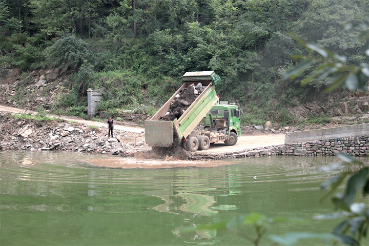 8月4日,工程車運(yùn)輸石頭、泥土填埋河道。