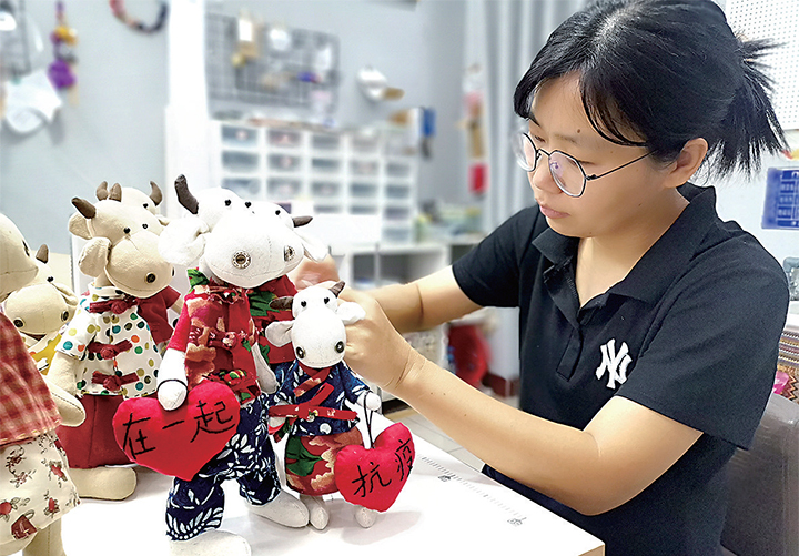 丁玲給布藝玩偶戴上縫有“抗疫”字樣的飾品