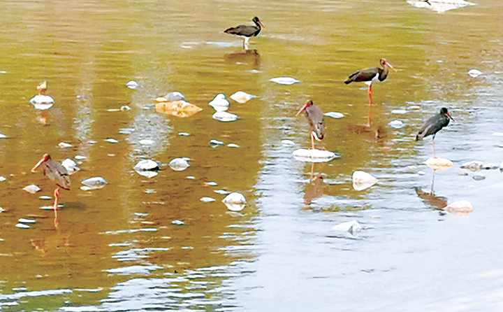 8月16日一早,河口村水庫迎來5位“稀客”。這5位“稀客”身體呈黑色,翼下和胸腹呈白色,修長的脖子,紅色的長喙,2條粉紅色的長腿。它們在水中歡快地覓食。吃飽喝足后,它們飛到了不遠處的淺灘上曬著太陽,梳理著羽毛,很是愜意。