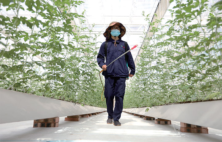 8月24日,在綠茵種子產(chǎn)業(yè)園西瓜制種大棚里,工作人員正在為西瓜苗噴灑葉面肥。李楠 馬正國(guó) 攝