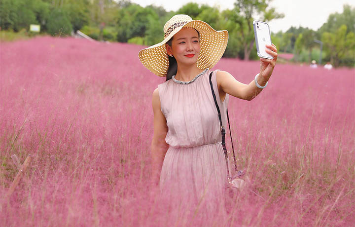 9月22日,市民在粉黛亂子草的“海洋”中自拍。記者 王興輝 攝