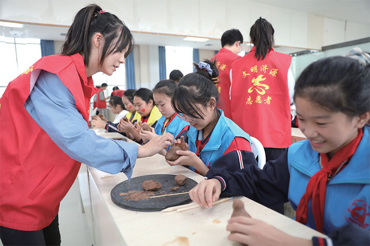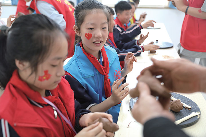 10月1日,孩子們?cè)谥谱髂嗨堋.?dāng)日,濟(jì)源市青少年活動(dòng)中心舉辦公益課堂,組織開(kāi)展“向國(guó)旗敬禮”系列活動(dòng),內(nèi)容包括紅色主題宣講、制作泥塑、剪紙等,讓孩子們學(xué)習(xí)革命歷史和傳統(tǒng)文化,將文化自信根植于身,讓愛(ài)國(guó)情懷厚植于心。據(jù)了解,濟(jì)源市青少年活動(dòng)中心今后將利用周末時(shí)間舉辦公益課堂。 記者 李楠 攝