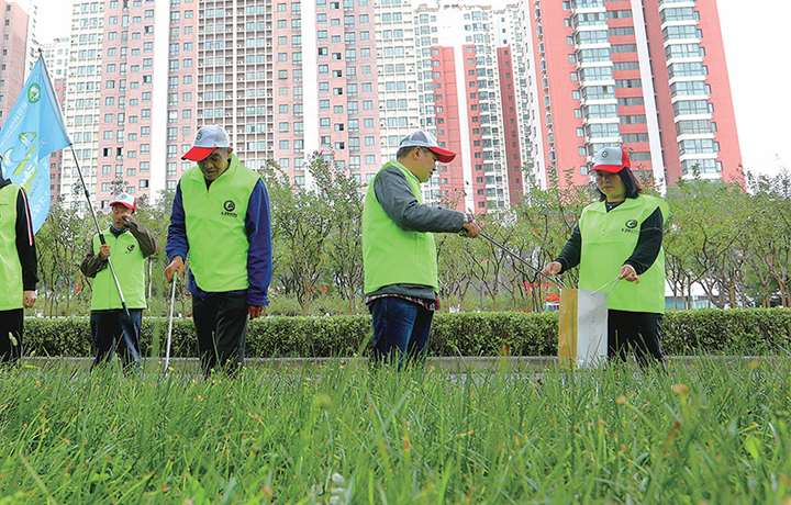 10月10日,環(huán)保志愿者們在黃河大道附近撿拾垃圾。