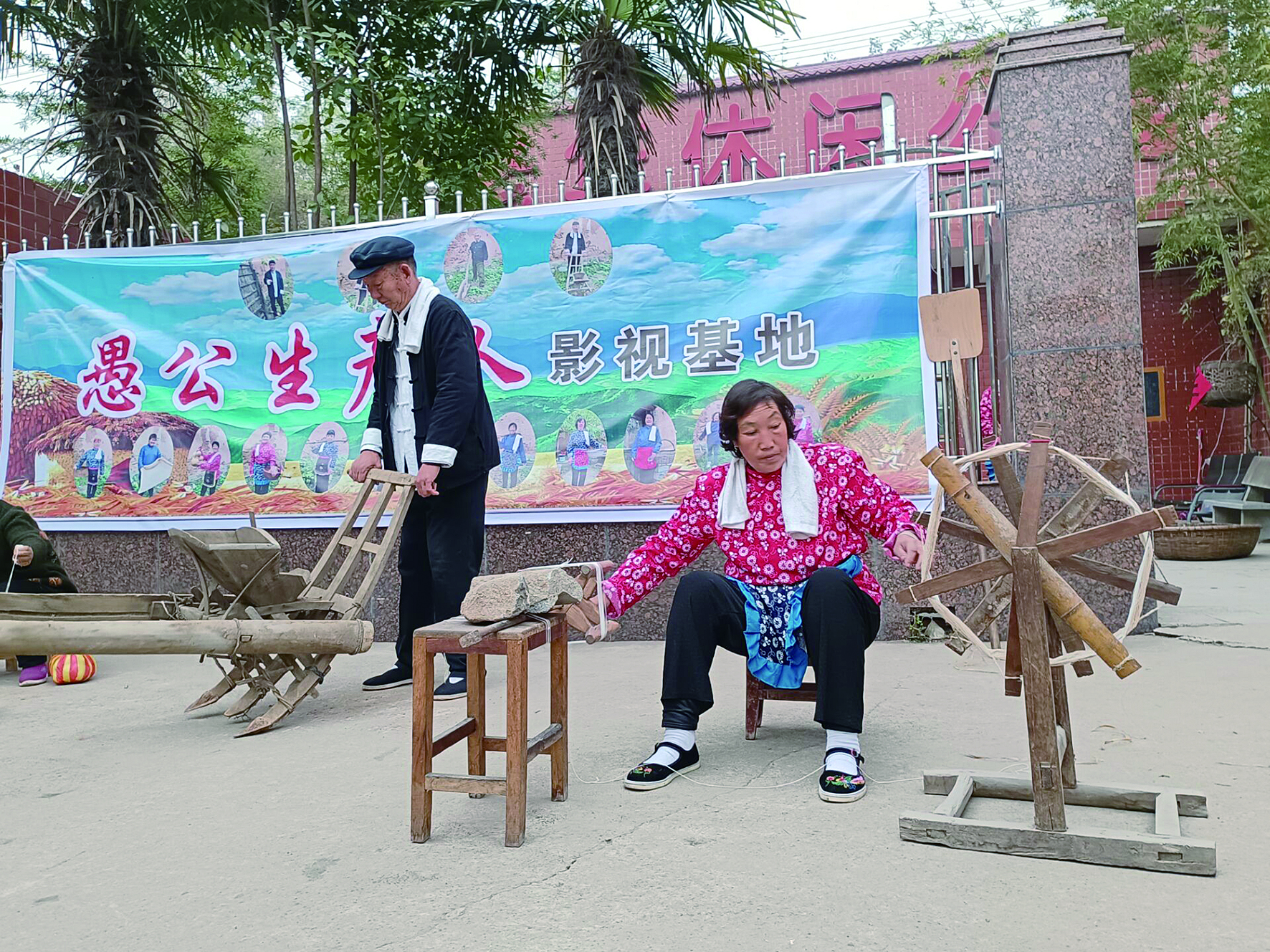 “回來……”村民孟福玲在空地上,推著木制播種機(jī),手握鞭子,演繹播種小麥的場景。學(xué)生范鎰蕾則拿著手機(jī),專心為村民們拍攝。