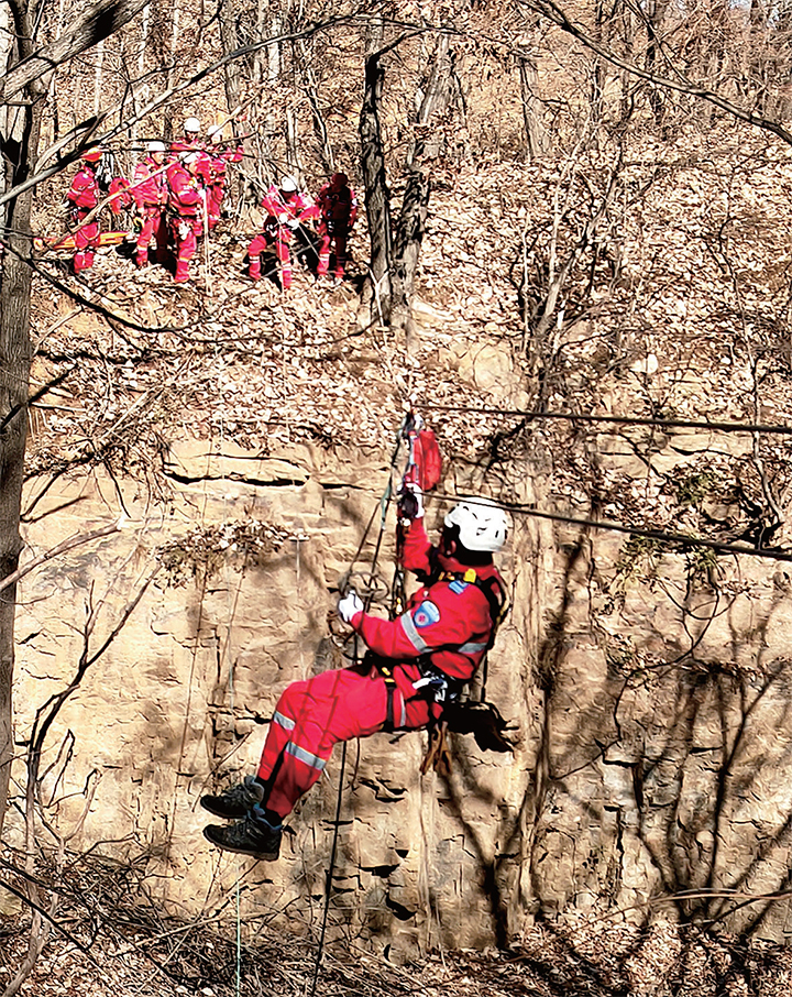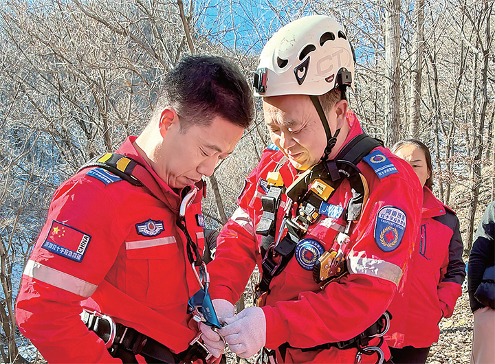 救援隊(duì)員進(jìn)行崖降前的準(zhǔn)備。