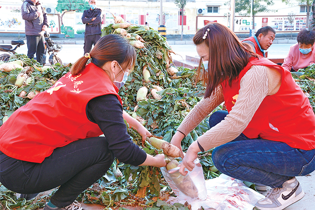 五龍口鎮(zhèn)聯(lián)戶黨員在分裝蘿卜。
