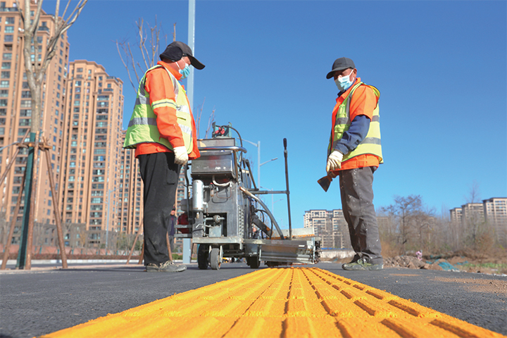 11月30日,在王屋路上,施工人員采用新型熱熔技術鋪設盲道。