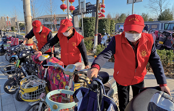教師志愿者正在將停放在路邊的電動自行車擺放整齊。