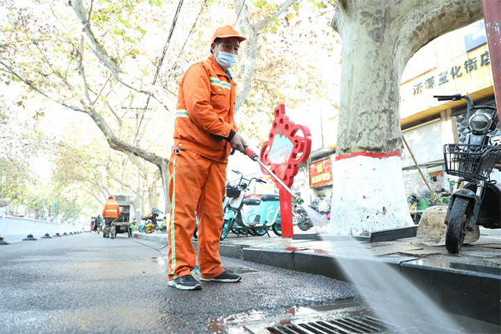 12月15日,環(huán)衛(wèi)工人在宣化街沖洗道路。
