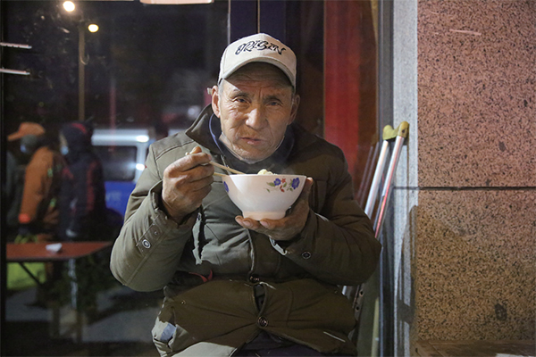 吃了兩大碗餃子的環(huán)衛(wèi)工人老李是愛(ài)心粥屋的“??汀?。“餃子特別好吃,寒冷的早上吃一碗,全身都不冷了,心里也暖暖的,我干起活兒來(lái)也更有勁兒了?!崩侠钫f(shuō)。臨走時(shí),他還專門向志愿者們道了謝:“辛苦你們了,謝謝所有的志愿者們。”(記者 王峰 文/圖)