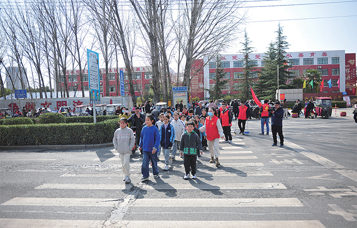 3月4日,在黃河路小學門口,志愿者正護送學生過馬路。 記者 張佩佩 侯琪琳 實習生 王丹楓 攝