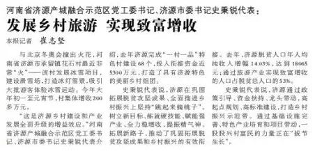 3月5日,《光明日報》刊發(fā)兩會特刊,刊登《河南省濟源產(chǎn)城融合示范區(qū)黨工委書記、濟源市委書記史秉銳代表:發(fā)展鄉(xiāng)村旅游 實現(xiàn)致富增收》一文。