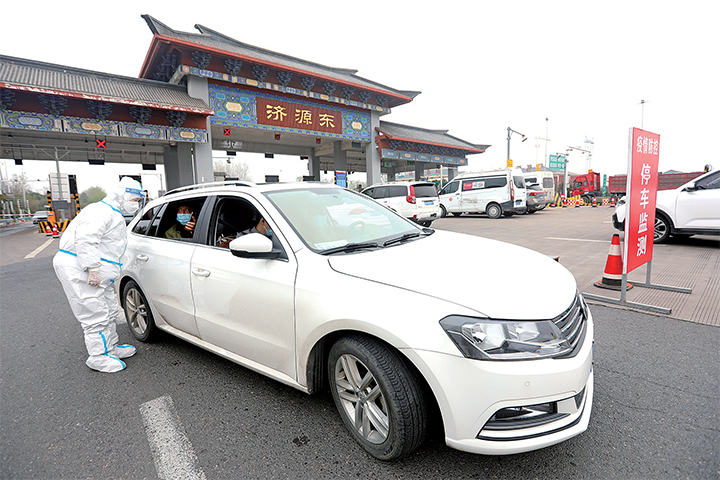 3月21日,在濟(jì)源高速東站,工作人員在查驗(yàn)返(來(lái))濟(jì)人員的健康碼、行程卡及48小時(shí)內(nèi)核酸檢測(cè)陰性證明。