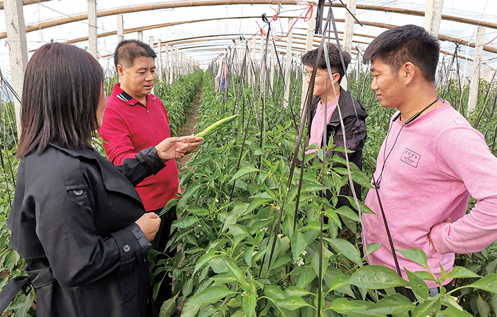 李快廷(左二)和技術(shù)員溝通辣椒生長問題