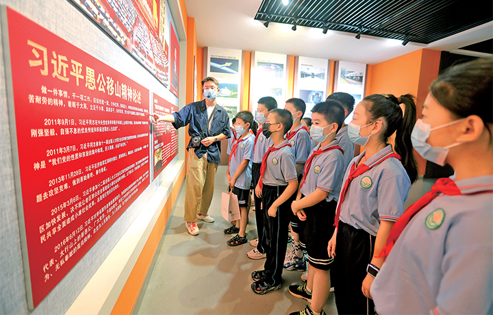 7月27日,在愚公移山精神展覽館,小學(xué)生認(rèn)真聆聽講解員講解。