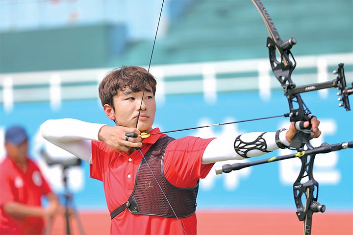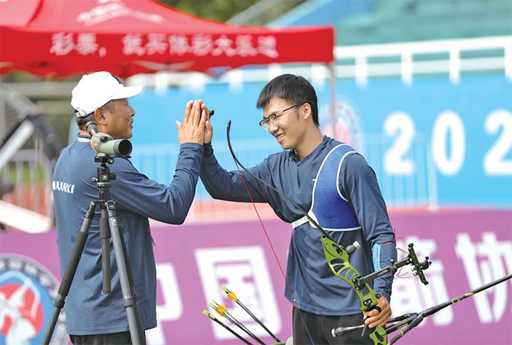 8月4日,2022年全國射箭奧林匹克項目錦標賽反曲弓項目順利落幕,新疆隊安琦軒、江蘇隊史鎮(zhèn)旗分別獲得女子反曲弓個人賽、男子反曲弓個人賽冠軍。(記者 李楠 攝)