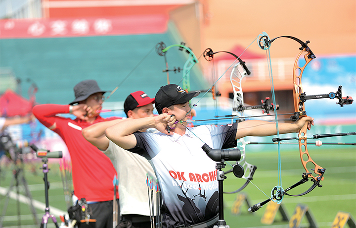 8月5日,2022年全國射箭奧林匹克項目錦標(biāo)賽迎來復(fù)合弓項目的比賽。經(jīng)過輪賽、淘汰賽,8名選手闖入女子、男子復(fù)合弓個人決賽。圖為男子復(fù)合弓個人50米輪賽現(xiàn)場。 記者 李楠 攝