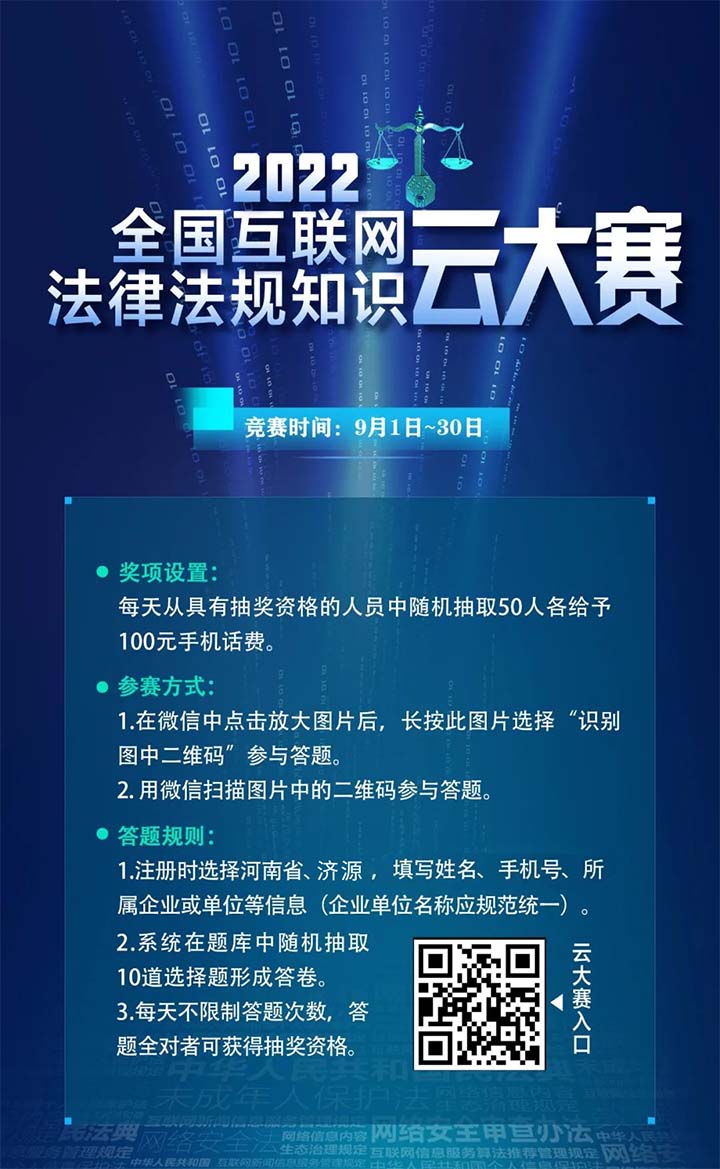 快來(lái)參與贏100元話費(fèi)!2022全國(guó)互聯(lián)網(wǎng)法律法規(guī)知識(shí)云大賽開(kāi)始啦!