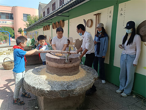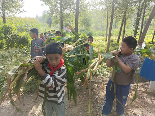 9月22日中午,一場“玉米也瘋狂”為“校園豐收月”畫上圓滿句號(hào)?;顒?dòng)分為5個(gè)環(huán)節(jié),從收到運(yùn),再到加工品嘗,以小組競技比賽的方式,同學(xué)們見證農(nóng)耕時(shí)代玉米的加工全過程。第一環(huán)節(jié)掰玉米,老師帶領(lǐng)同學(xué)們來到了校園旁邊的農(nóng)田里,農(nóng)民爺爺示范動(dòng)作要領(lǐng),每位教師帶領(lǐng)一組學(xué)生,連扯帶掰,同學(xué)們不拍剌手不怕熱,第三小組獲得掰玉米第一名;第二環(huán)節(jié)為運(yùn)玉米,以接力的形式將玉米運(yùn)送到指定位置,摔倒了爬起來繼續(xù)跑,在同學(xué)們的加油聲中,第一小組獲得運(yùn)玉米第一名;第三環(huán)節(jié)為剝玉米,每組一小桶玉米棒,最先把所有玉米棒全部剝成玉米粒即為獲勝,萬事開頭難,開始大家都比較慢,很快同學(xué)們就找到了訣竅,一排一排剝最快,最終第五小組獲得第一名;第四環(huán)節(jié)加工玉米糝,同學(xué)們將玉米粒倒在石磨上,然后兩人一組體驗(yàn)推磨,隨著磨盤轉(zhuǎn)動(dòng),玉米粒被粉碎后從石磨中間流出,經(jīng)過幾遍重復(fù)加工,玉米粒變成了玉米糝;第五環(huán)節(jié)為品嘗環(huán)節(jié),師生在學(xué)校的大灶臺(tái)前燒火加水,開始做飯,將磨好的玉米糝、花生、南瓜混合到一起,做成了一鍋甜美的玉米羹,品嘗著玉米羹,幸福和甜美定格在每個(gè)人的臉上。最后經(jīng)過積分評比,第五小組獲得本次“豐收節(jié)”冠軍組,武金函等6名同學(xué)榮獲“優(yōu)秀小農(nóng)夫”稱號(hào),學(xué)校為她們頒發(fā)了獎(jiǎng)狀和特殊獎(jiǎng)品。