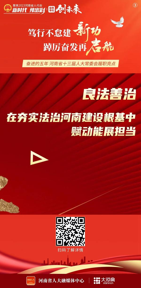 為省科學院專門立法,解決重建重振痛點;確保一渠清水潤北方,在法治軌道上推進南水北調飲用水水源保護;通過革命老區(qū)振興發(fā)展促進條例,為革命老區(qū)插上騰飛的“翅膀”;出臺數(shù)字經(jīng)濟促進條例,加快“數(shù)字河南”建設……