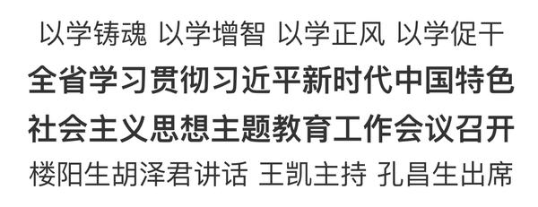 4月6日,全省學(xué)習(xí)貫徹習(xí)近平新時代中國特色社會主義思想主題教育工作會議召開,貫徹落實習(xí)近平總書記在學(xué)習(xí)貫徹習(xí)近平新時代中國特色社會主義思想主題教育工作會議上重要講話精神和中央關(guān)于在全黨深入開展主題教育的意見,安排部署我省主題教育工作。省委書記樓陽生、中央第九指導(dǎo)組組長胡澤君講話,省長王凱主持,省政協(xié)主席孔昌生出席。