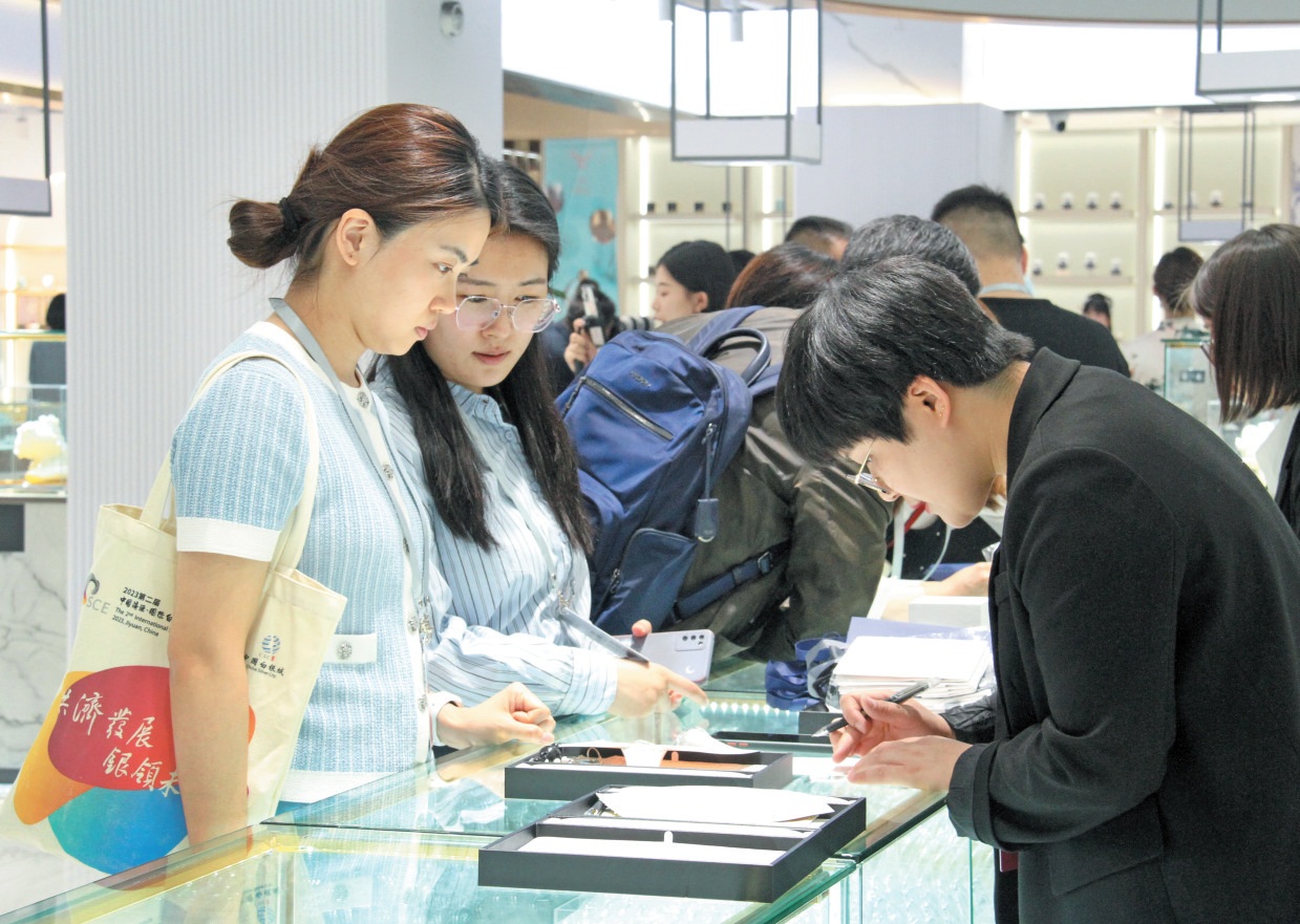 4月18日,2023第二屆中國(guó)濟(jì)源·國(guó)際白銀文化博覽會(huì)開幕。其間,精心策劃的中國(guó)濟(jì)源·國(guó)際白銀產(chǎn)業(yè)博覽會(huì)現(xiàn)場(chǎng)人頭攢動(dòng),熱鬧非凡。八方賓客賞珍寶、購(gòu)飾品,氛圍濃厚。(本報(bào)記者 王鴻斐 攝)