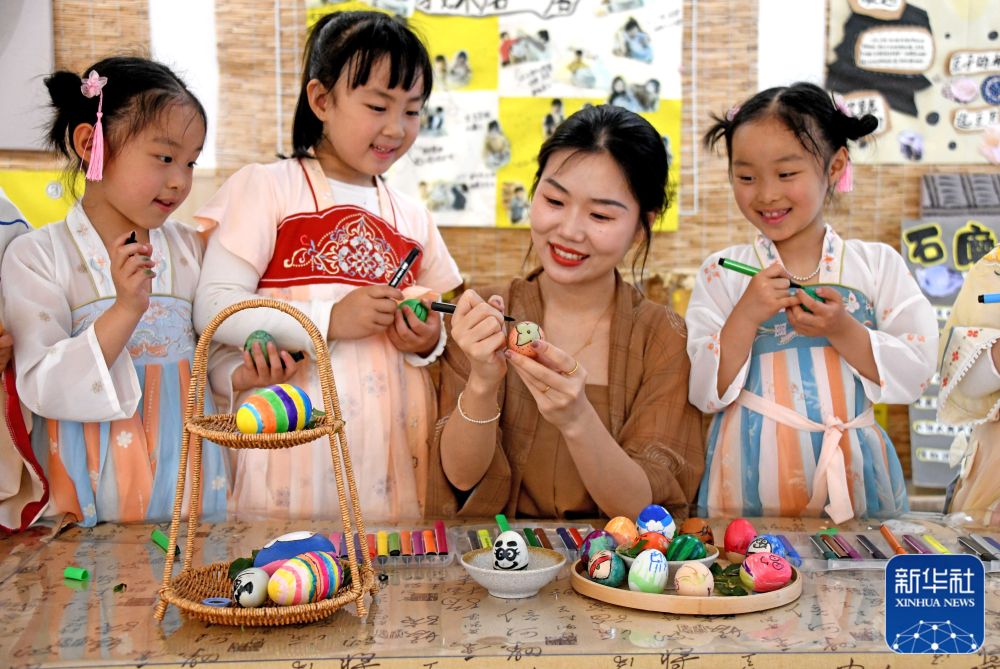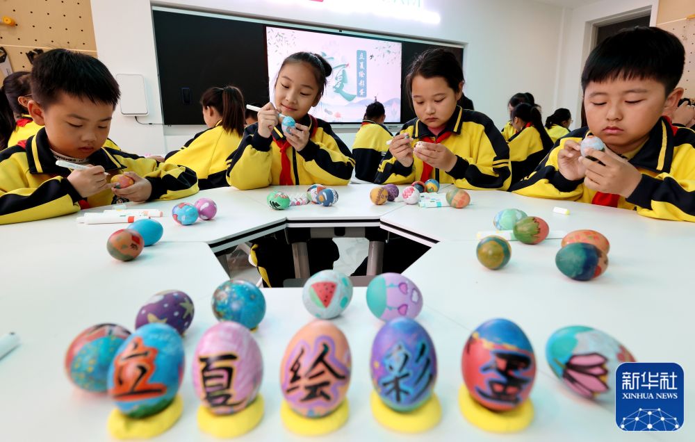 5月5日,在山東省棗莊市東湖小學,學生們在繪制彩蛋。新華社發(fā)(孫中喆 攝)
