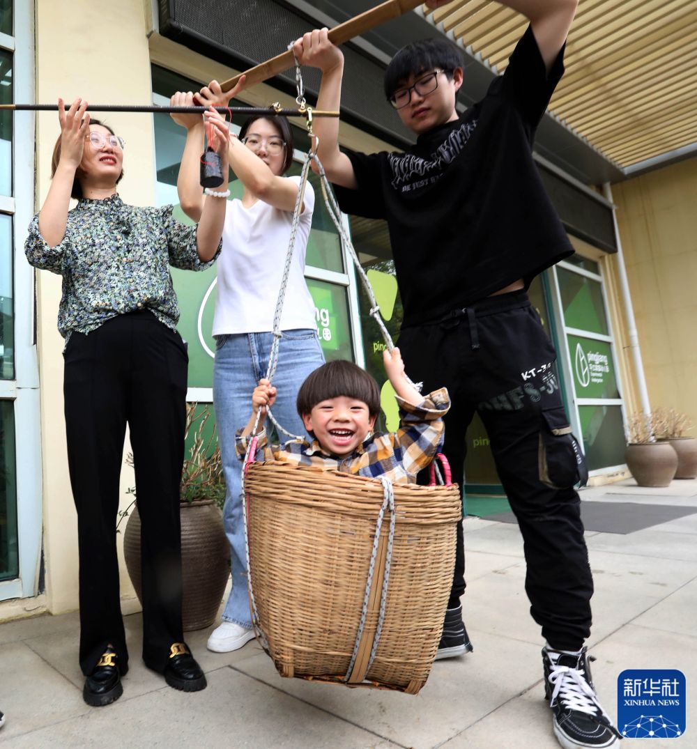 5月5日,在浙江省建德市新安江街道府西社區(qū),孩子和家長玩掛蛋游戲。新華社發(fā)(寧文武 攝)
