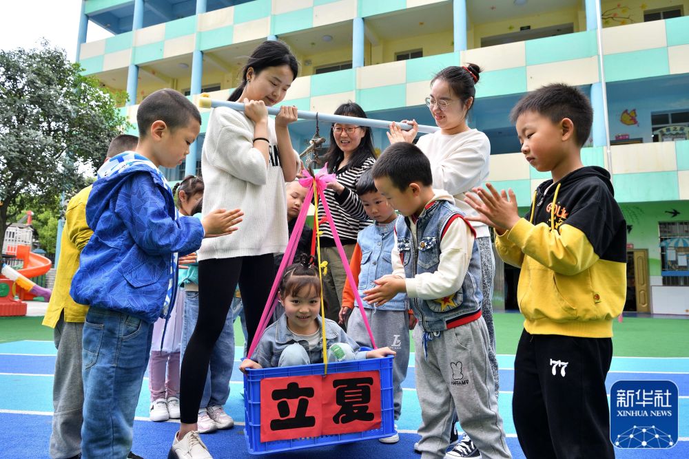 5月5日,河南省濟源市第一幼兒園的孩子體驗立夏習俗。新華社發(fā)(段二平 攝)