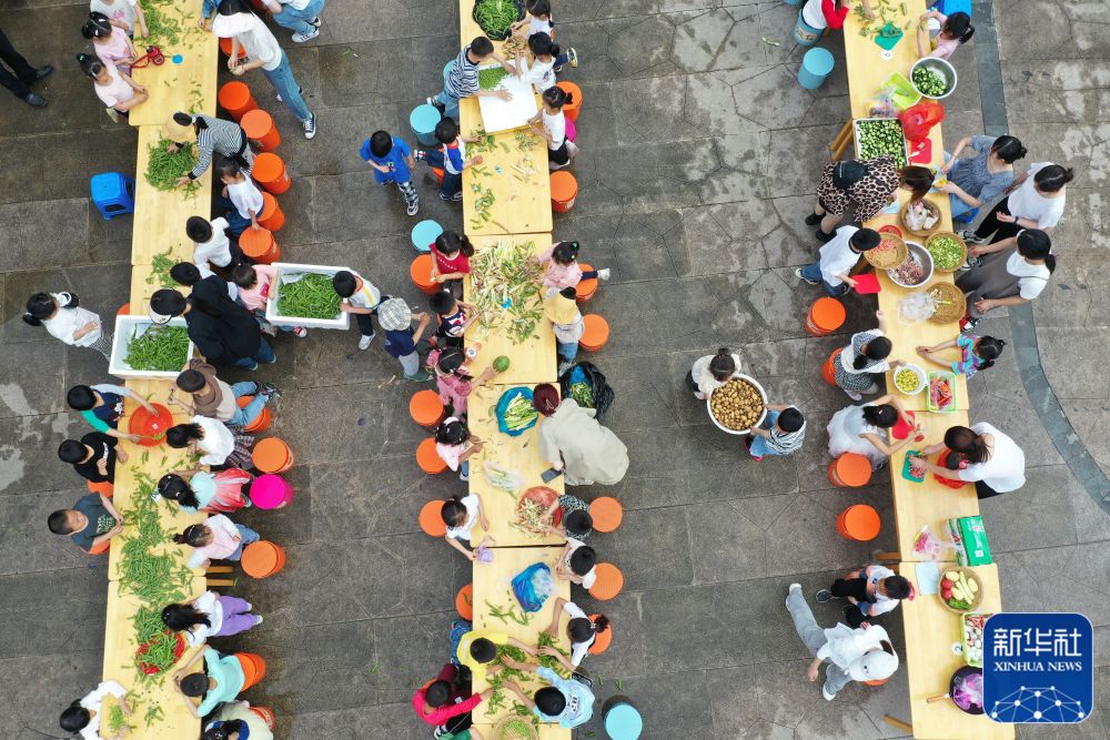 5月5日,浙江省湖州市德清縣乾元鎮(zhèn)第二幼兒園的孩子和老師在整理燒立夏飯的食材(無人機照片)。新華社發(fā)(倪立芳 攝)