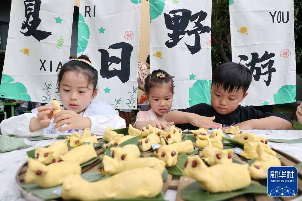 5月5日,浙江省湖州市德清縣三橋幼兒園的小朋友在捏立夏狗。新華社發(fā)(謝尚國 攝)