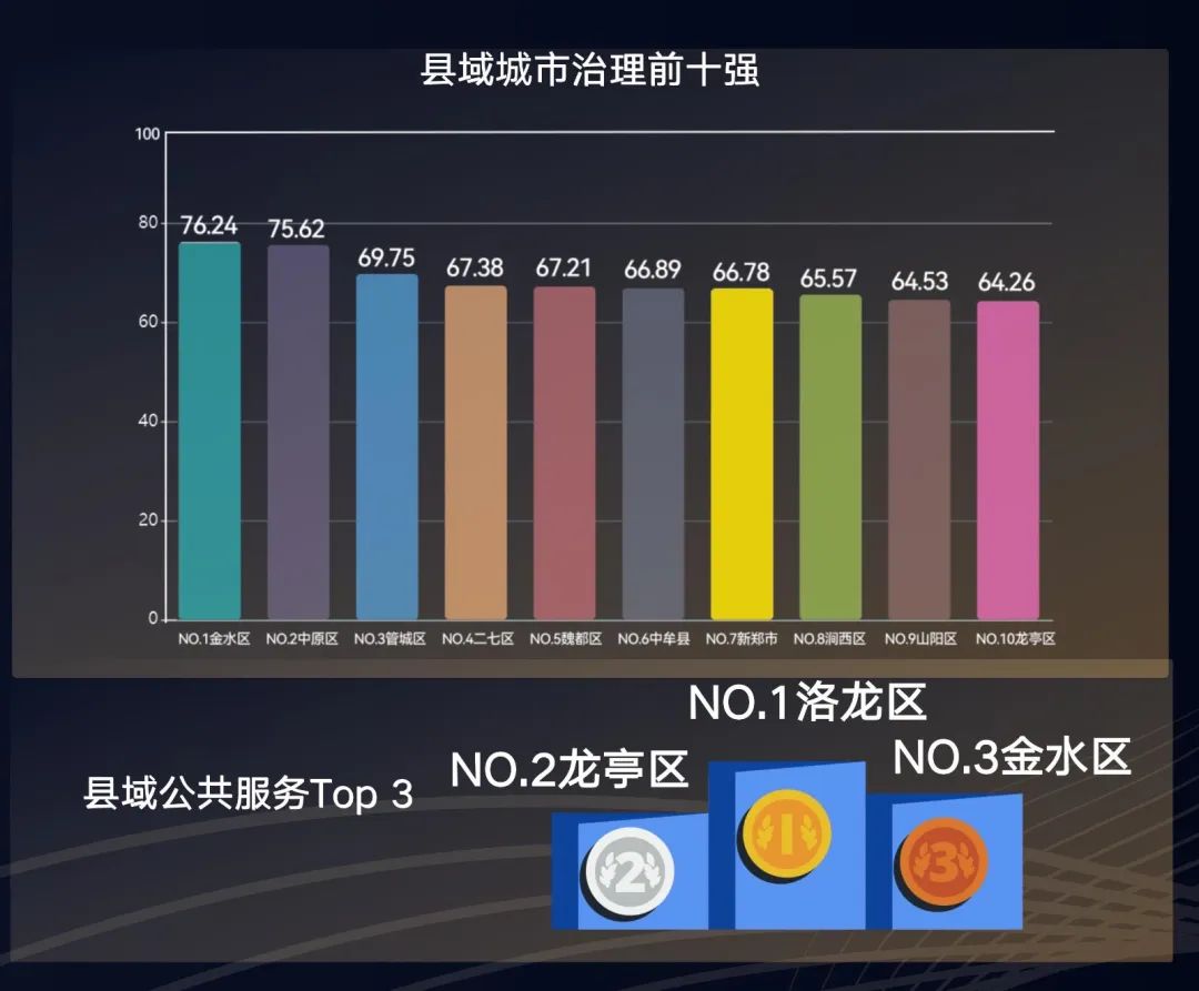 縣域城市治理前十強(qiáng),分別為鄭州市金水區(qū)、鄭州市中原區(qū)、鄭州市管城區(qū)、鄭州市二七區(qū)、許昌市魏都區(qū)、鄭州市中牟縣、鄭州市新鄭市、洛陽市澗西區(qū)、焦作市山陽區(qū)、開封市龍亭區(qū)??h域公共服務(wù)TOP3為洛陽市洛龍區(qū)、開封市龍亭區(qū)、鄭州市金水區(qū)。
