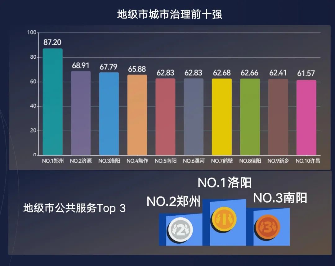 在該報(bào)告中,公布了地級(jí)市城市治理前十強(qiáng),分別為鄭州、濟(jì)源、洛陽、焦作、南陽、漯河、鶴壁、信陽、新鄉(xiāng)、許昌。地級(jí)市公共服務(wù)TOP3為洛陽、鄭州、南陽。