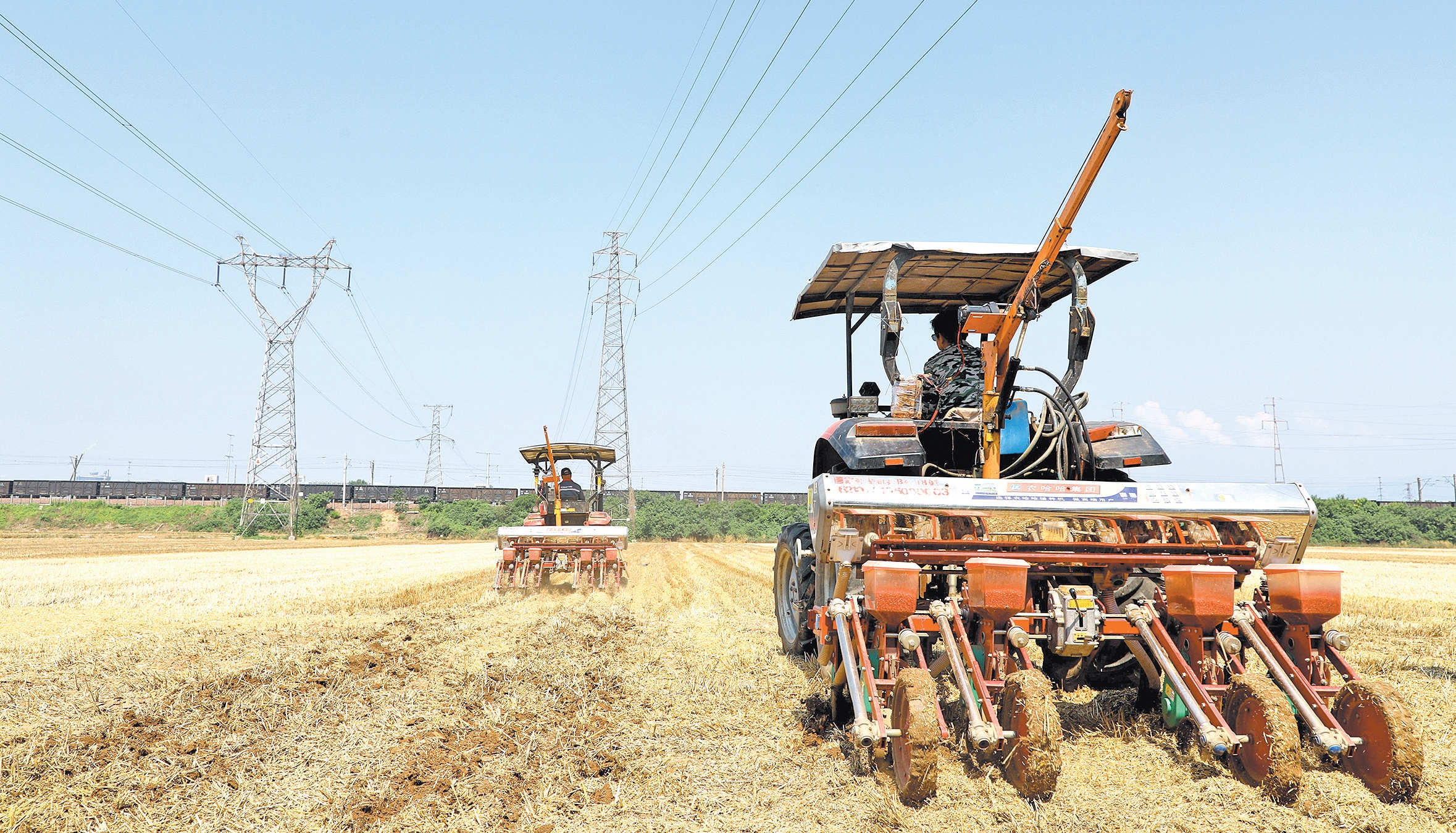 ?6月1日,雨后天晴的第二天,沈丘縣周營鎮(zhèn)馬營村一處麥田里機聲隆隆。兩臺輪式收割機往返穿梭,開足馬力搶收著連片的小麥,不遠處,數(shù)臺農(nóng)機緊跟其后進行土地旋耕、玉米播種,整個過程無縫銜接。