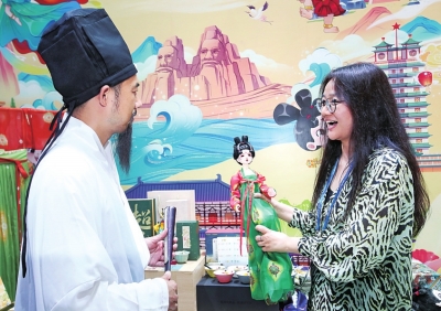 在河南館內(nèi),參展商向外地游客介紹唐宮夜宴玩偶