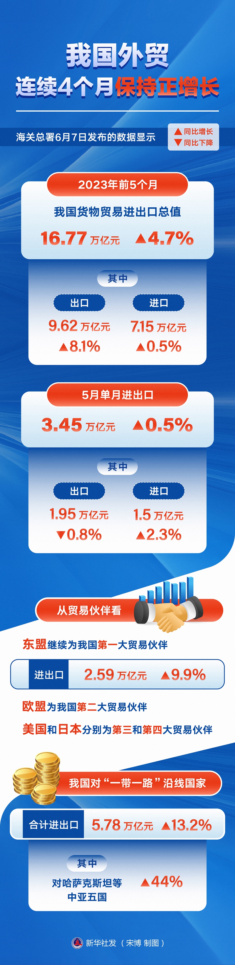 新華社北京6月7日電 面對(duì)外需走弱帶來(lái)的挑戰(zhàn),我國(guó)外貿(mào)韌性持續(xù)顯現(xiàn)。海關(guān)總署7日發(fā)布的數(shù)據(jù)顯示,今年前5個(gè)月,我國(guó)貨物貿(mào)易進(jìn)出口總值16.77萬(wàn)億元,同比增長(zhǎng)4.7%。其中5月單月進(jìn)出口3.45萬(wàn)億元,增長(zhǎng)0.5%,月度進(jìn)出口連續(xù)4個(gè)月保持正增長(zhǎng)。