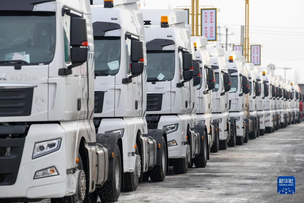 出口中亞國(guó)家的卡車在新疆巴克圖口岸等候出境(2月4日攝)。新華社記者 胡虎虎 攝