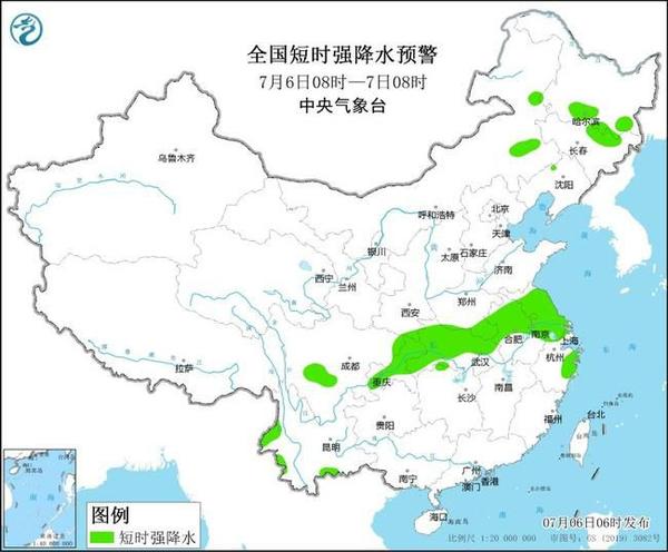 預(yù)計(jì)7月6日08時至7日08時,內(nèi)蒙古東南部、黑龍江南部、吉林中東部、遼寧北部和西部、安徽中北部、江蘇、上海、湖北東部、浙江東部等地的部分地區(qū)將有8-10級雷暴大風(fēng)或冰雹天氣;內(nèi)蒙古東南部、黑龍江南部、吉林東部、河南南部、安徽中北部、江蘇、上海、湖北、浙江北部和東部、四川東部和南部、重慶中西部和北部、云南西部和南部等地的部分地區(qū)將有短時強(qiáng)降水天氣,小時雨量20-50毫米,局地可達(dá)60毫米以上。