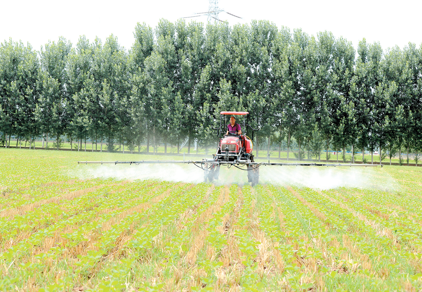 7月6日,梨林鎮(zhèn)大許村,農(nóng)民駕駛機(jī)械在大豆田里噴灑農(nóng)藥。