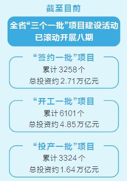 7月24日,省十四屆人大常委會第四次會議聽取了省人民政府關(guān)于“三個(gè)一批”項(xiàng)目建設(shè)活動(dòng)開展情況的報(bào)告。根據(jù)報(bào)告,截至目前,全省“三個(gè)一批”項(xiàng)目建設(shè)活動(dòng)已滾動(dòng)開展八期,“簽約一批”項(xiàng)目累計(jì)3258個(gè)、總投資約2.71萬億元,“開工一批”項(xiàng)目累計(jì)6101個(gè)、總投資約4.85萬億元,“投產(chǎn)一批”項(xiàng)目累計(jì)3324個(gè)、總投資約1.64萬億元。