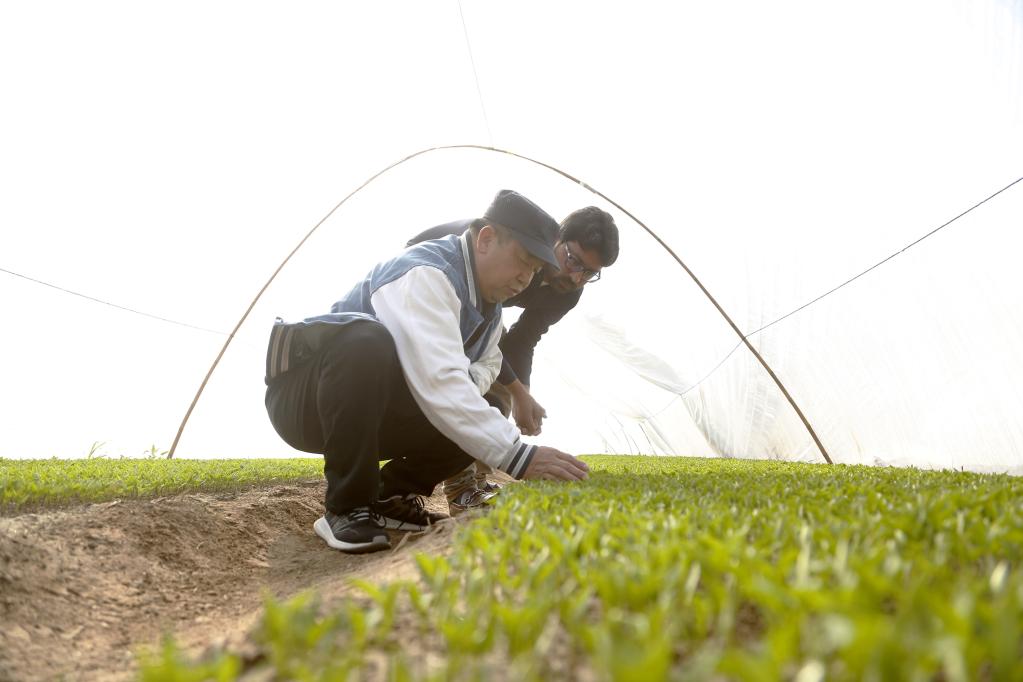 巴基斯坦旁遮普省木爾坦的中巴辣椒訂單種植項目辣椒育苗大棚內(nèi),中國農(nóng)業(yè)專家?guī)ьI巴基斯坦技術員查看辣椒秧苗生長情況。