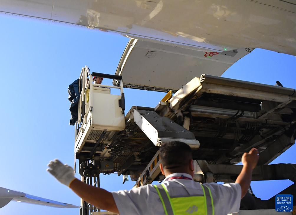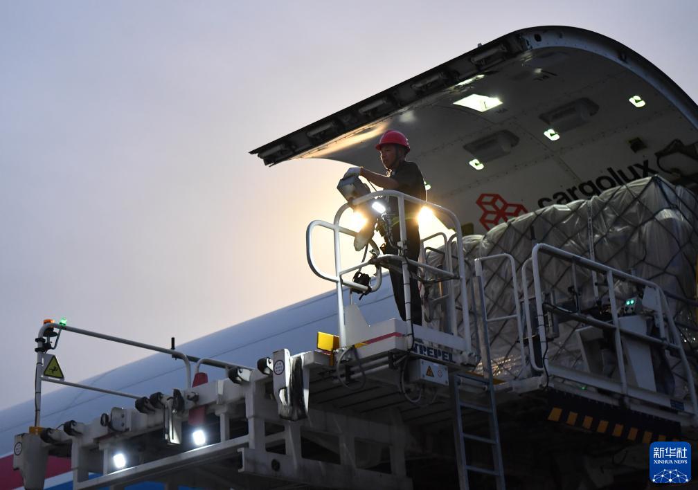 8月1日,工作人員在中國鄭州新鄭國際機場為一架盧森堡貨航貨機裝貨。新華社記者 李嘉南 攝