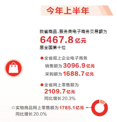 上半年全省規(guī)上企業(yè)電子商務(wù)銷售額為3096.9億元,采購額為1688.7億元。值得關(guān)注的是,數(shù)字經(jīng)濟賦能消費擴容提質(zhì),網(wǎng)上零售數(shù)據(jù)亮眼。上半年全省網(wǎng)上零售額為2109.7億元,同比增長20.3%。其中實物商品網(wǎng)上零售額為1785.1億元,同比增長20.0%。