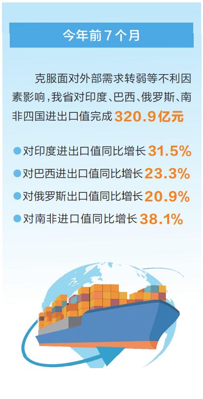 近年來,河南與其他金磚國家的貿(mào)易合作持續(xù)升溫。2021年,我省對印度、南非、俄羅斯、巴西四國進出口值同比增長21.2%;2022年,我省對上述四國的進出口值為554.5億元,增幅達20.3%。今年前7個月,克服面對外部需求轉(zhuǎn)弱等不利因素影響,我省對上述四國進出口值完成320.9億元,其中,對印度進出口值同比增長31.5%、對巴西進出口值同比增長23.3%、對俄羅斯出口值同比增長20.9%、對南非進口值同比增長38.1%,體現(xiàn)出了雙方貿(mào)易往來的潛力和韌勁。