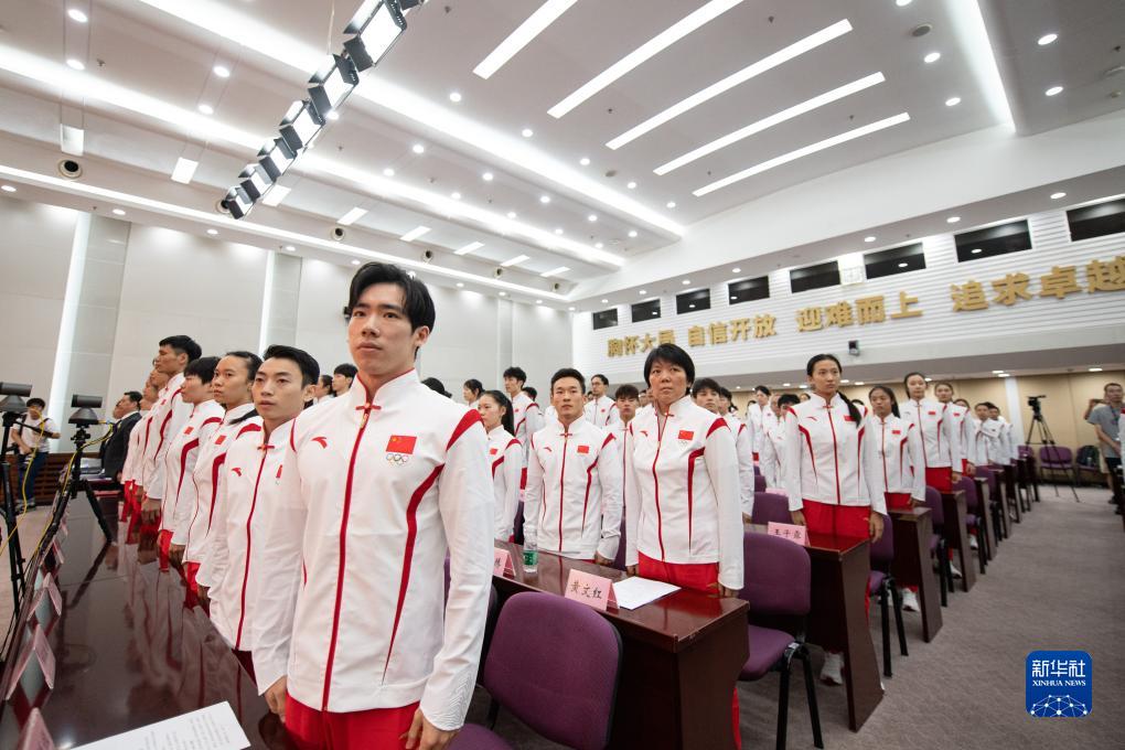 中國(guó)體育代表團(tuán)團(tuán)部人員和射擊、體操、蹦床、藝術(shù)體操、擊劍、自行車、田徑、花樣游泳、跆拳道等項(xiàng)目參賽運(yùn)動(dòng)隊(duì)代表現(xiàn)場(chǎng)參會(huì),代表團(tuán)其他隊(duì)伍通過視頻參加了會(huì)議。(記者 馬邦杰 周欣)