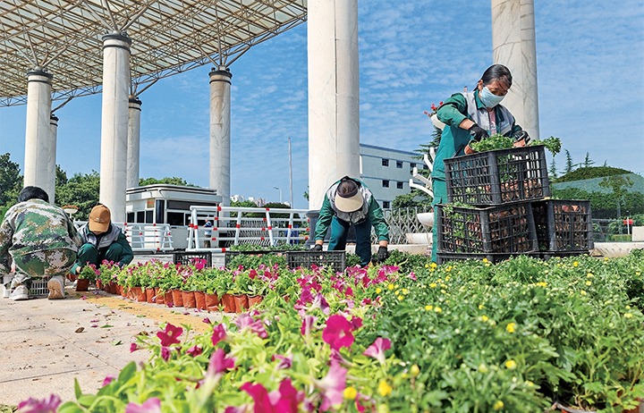 9月21日,第一行政區(qū),工作人員正在擺放花卉。