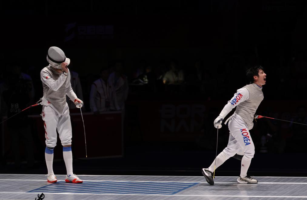 中國男子花劍隊(duì)當(dāng)日有驚喜有遺憾。團(tuán)體半決賽面對世界排名第一、今年世錦賽和亞錦賽上均摘得金牌的日本隊(duì),中國隊(duì)以45:44逆轉(zhuǎn)險(xiǎn)勝對手,但在決賽中以38:45不敵衛(wèi)冕冠軍韓國隊(duì)。中國隊(duì)陳海威賽后說:“決賽我們都付出了所有,但還是比較遺憾?!?/p>