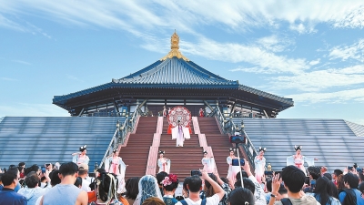 游客在隋唐洛陽城明堂前觀看古裝演藝。隋唐洛陽城景區(qū)供圖
