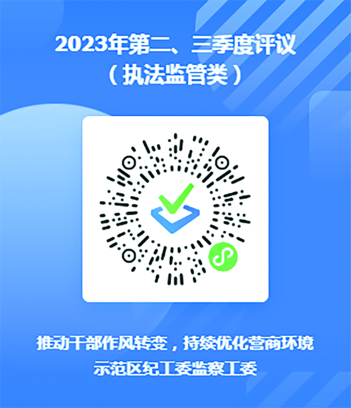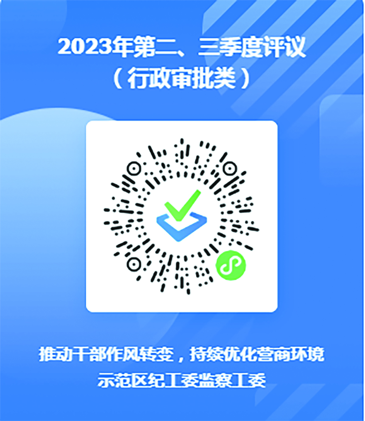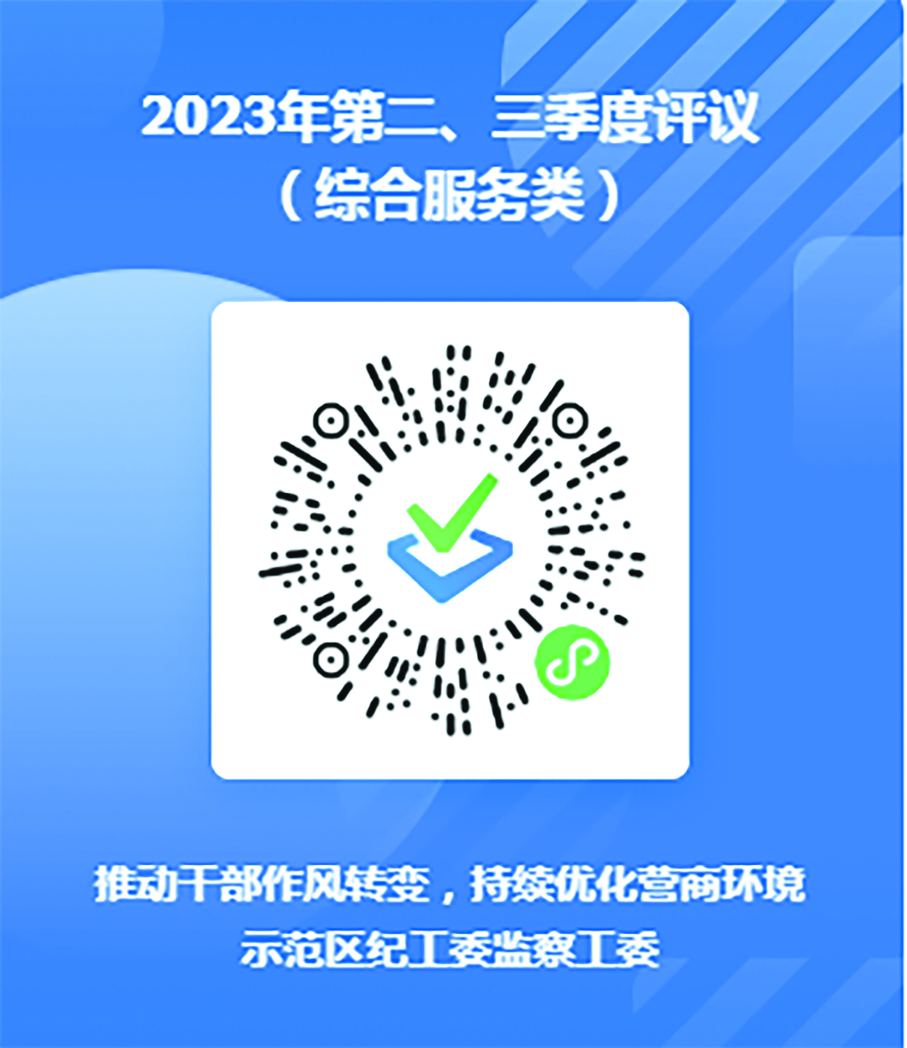 本次評議時間為2023年10月10日至2023年10月25日。請通過微信掃描下方二維碼,本著客觀公正、實事求是的態(tài)度,按照“好、較好、一般、差”選項進(jìn)行評議。