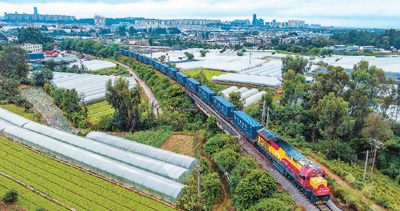 “滬滇·瀾湄線”國際貨運班列開行首發(fā)儀式近日在云南省昆明市王家營西集裝箱中心站舉行。滿載來自東南亞地區(qū)的水果、橡膠和白糖、金屬硅等產(chǎn)品的班列,駛向上海臨港新片區(qū)蘆潮港站。圖為“滬滇·瀾湄線”國際貨運班列駛出王家營西集裝箱中心站。